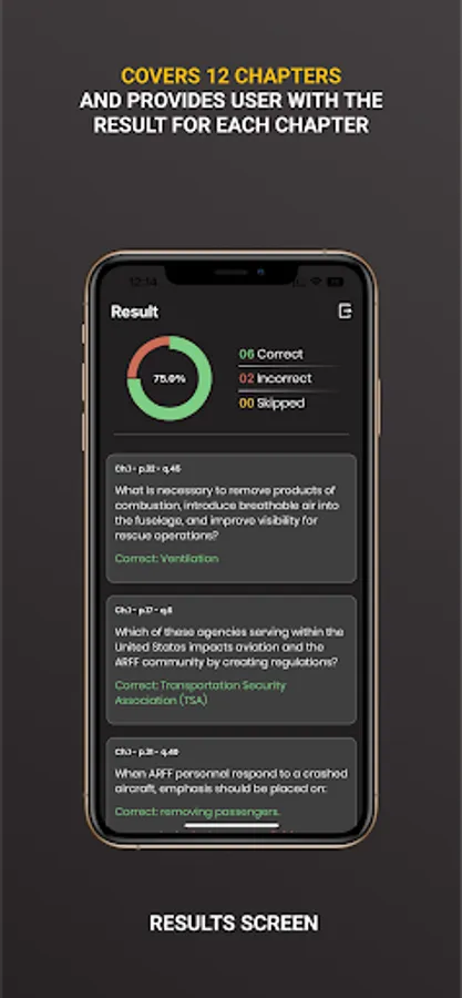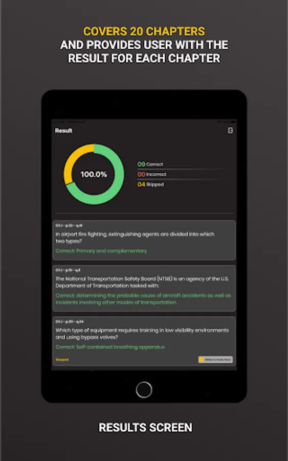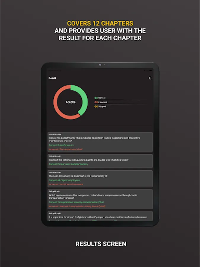 Prepare for your certification exams while on the go! Exam Prep Plus is a portable, interactive version of our print Exam Prep product and contains 792 questions. Create a custom exam by choosing any of the 12 chapters covered in the Aircraft Rescue and Firefighting 6th Edition Manual. Exam Prep Plus tracks and records your progress allowing you to review your exams and study your weaknesses. In addition, your missed questions are automatically added to your study deck. With its easy-to-use interface and flexible navigation, you're sure to find it a wonderful addition to your collection of study tools.