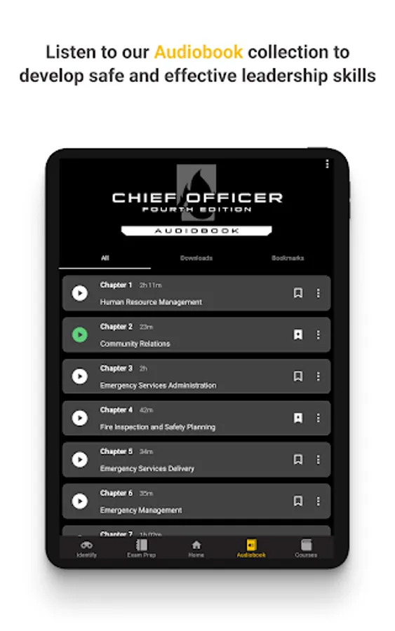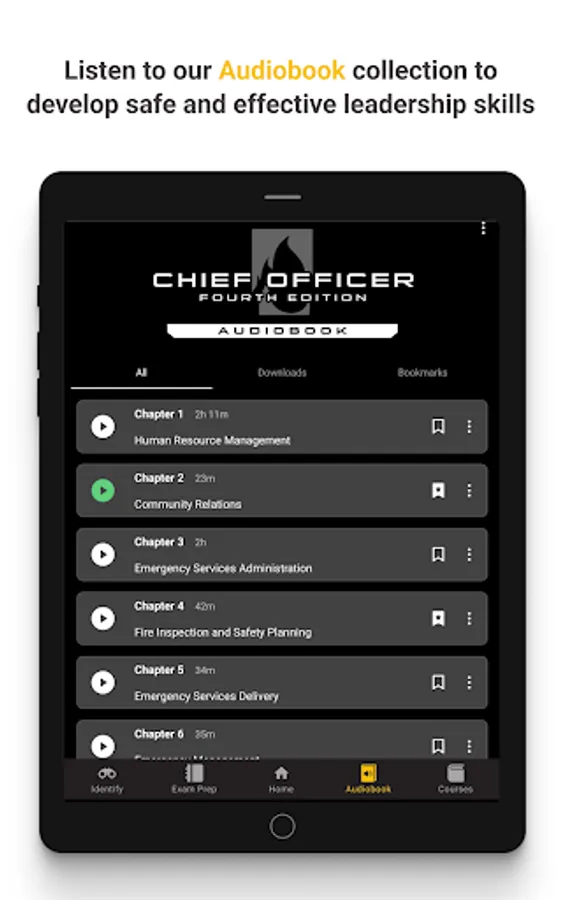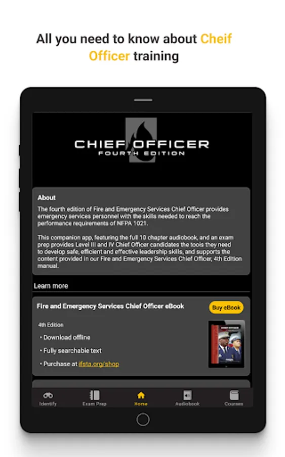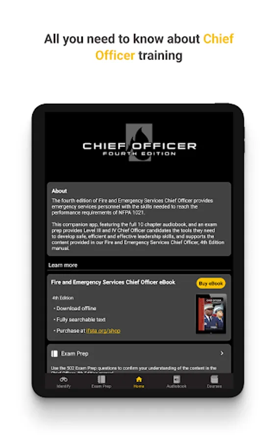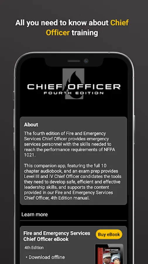 The Fire and Emergency Services Chief Officer, 4th edition, companion app is now available! This companion app includes our 510 question Exam Prep to test your understanding of the manual. All 10 chapters are now available in an audiobook format allowing you to access it offline and listen at your own speed.