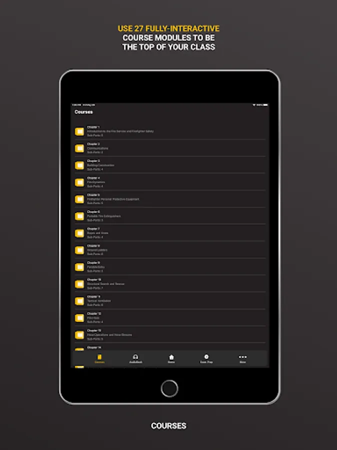 The Essentials of Fire Fighting, 7th Edition, Manual meets ALL of the NFPA 1001, 2019 JPRs and is the complete source for firefighter recruit and refresher training. This app includes the basic duties assigned to Fire Fighter I and II firefighters. Included FREE in this app are Skills Videos, Tool Identification, Flashcards, and free access to Chapter 1 of the Exam Prep, Interactive Course and the Audiobook.