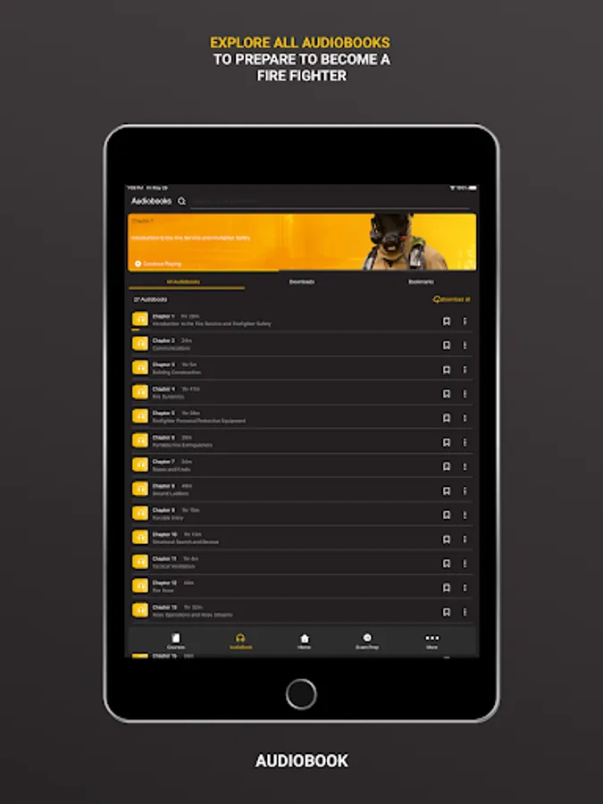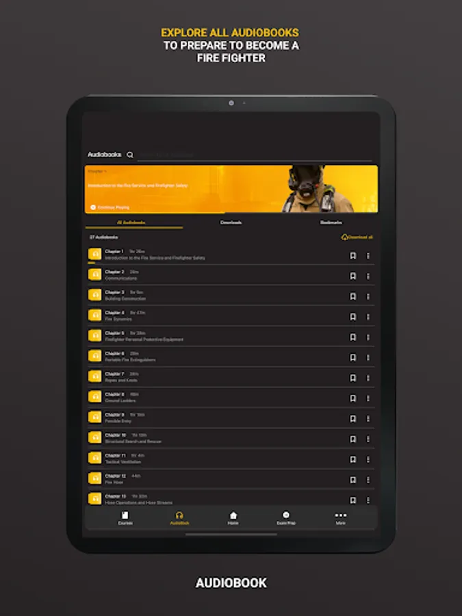 Purchase the Essentials of Fire Fighting, 7th Edition, Audiobook through the app. All 27 chapters are narrated in their entirety for 34 hours of content. Features include offline access, bookmarks, and the ability to listen at your own speed. All users have free access to Chapter 1.