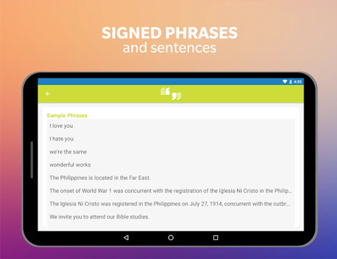 The Iglesia Ni Cristo Sign Language App is a project of the Christian Society for the Deaf under the Christian Family Organizations Office of the Iglesia Ni Cristo (Church Of Christ). It is part of the Church's continuous intensive efforts to reach out to and care for the Deaf, INC members and non-members alike.