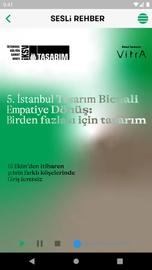 The ‘audio guide’ application, developed by the Istanbul Foundation for Culture and Arts for the 4th Istanbul Design Biennial in 2018, is renewed to accompany you at the 5th Istanbul Design Biennial, curated under the title of “Empathy Revisited: design for more than one” by Mariana Pestana, in 2020. This audio guide where you can get an idea about the conceptual framework of the biennial, and listen to audio narratives about the works exhibited in the streets of Istanbul and digitally in addition to Pera Museum and ARK Kültür, is designed for those who would like to tour the exhibition with a company, and others who would like to explore the exhibition from afar. Narrations belong to Yunus Kaan Yalman in Turkish, Berivan Yurtsevener in English, and Selda Yıldırım in Arabic.