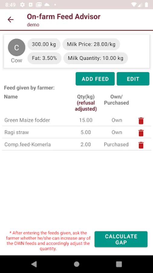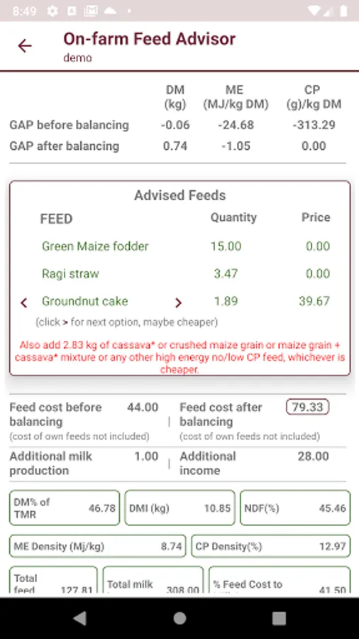 The On-farm Feed Advisor helps extension staff to advise farmers on how to balance their animals’ diet by matching nutrients and production in the feed offered, based on the animal body weight, milk production and stage of pregnancy. The application selects the cheapest locally available feeds to bridge the nutritional gap. The results are given in the form of an advice memo with information including cost of feeding and additional income before and after balancing the diet.