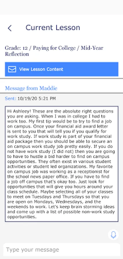 View all of your iMentor/mentor2.0 lessons. Respond to lesson messages sent by your mentor or mentee.