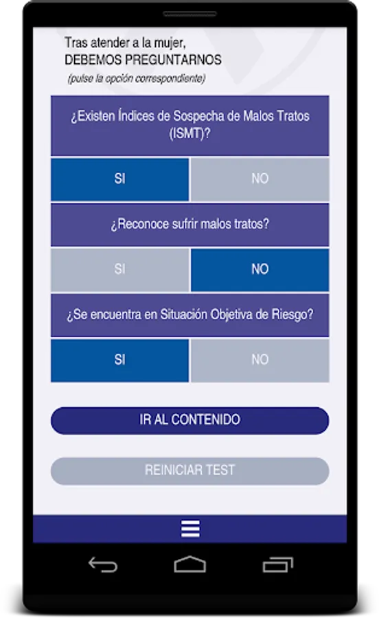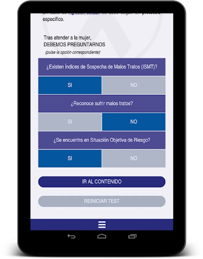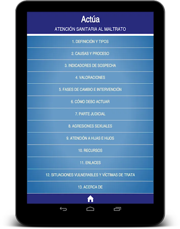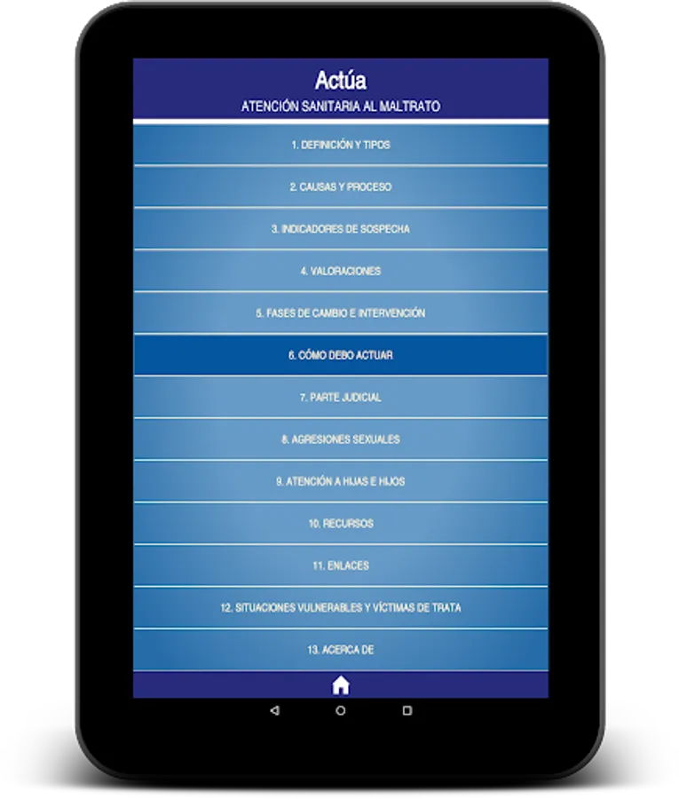 The App is the work of medical and medical Andalusia aware with the fight against gender violence, in collaboration with the CajaSur Foundation, the IMIBIC (Maimonides Institute for Biomedical Research Córdoba) and the Cordoba Platform Against Violence to Women , aiming to strengthen two important resources such as information and education as a form of action. It is essential a correct approach of abuse to ensure the welfare and change to a better situation of battered women and their environment. The tool is based on the "Andaluz Protocol for a Healthcare Response to Gender Violence" published in 2015 by the Ministry of Equality, Health and Social Policies of the Government of Andalusia. Everything is described graphically, simple and summarized for use as a tool for daily consultation way.