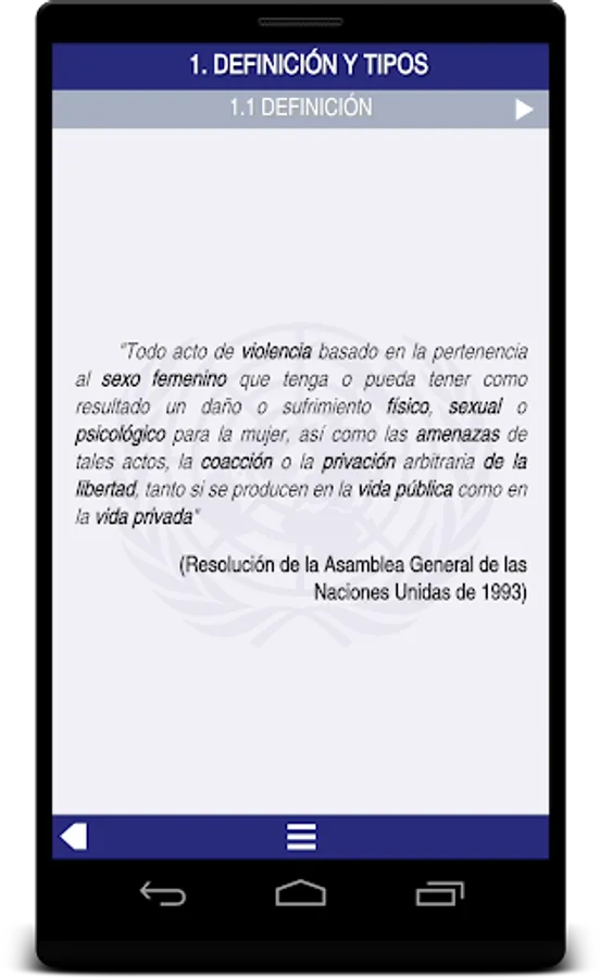 The application displays other sections as what are the different types of gender violence that may exist, how the process and what causes should be developed, indicators of suspicion that makes us think that a woman is in a situation of abuse, different phases through which women can pass along the process, what is the legal part and how it should be filled, specific attention to sexual assault, how they should care for and dependent children of women and resources, associations and websites with which we in Andalusia for full care of women and their environment, with special description of provincial and local branches of the Andalusian women's Institute (IAM).