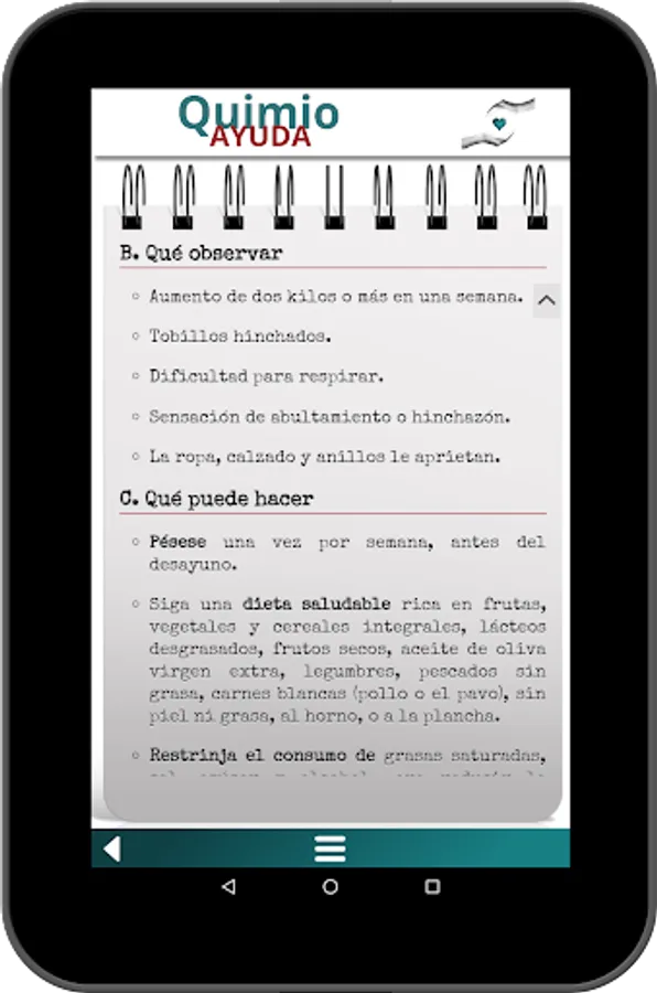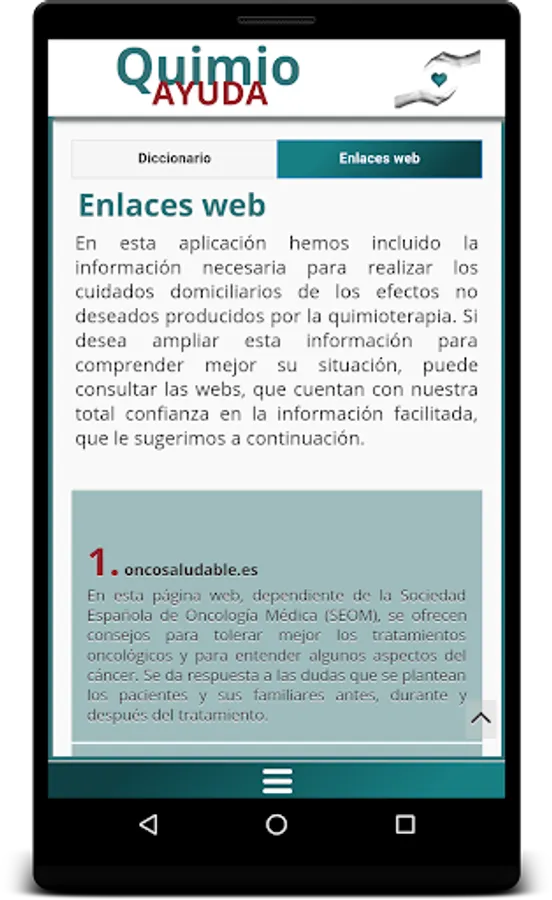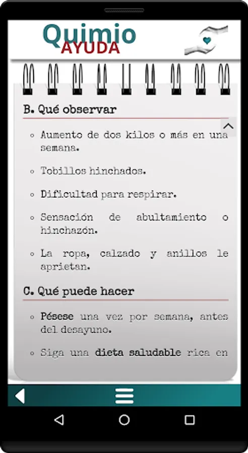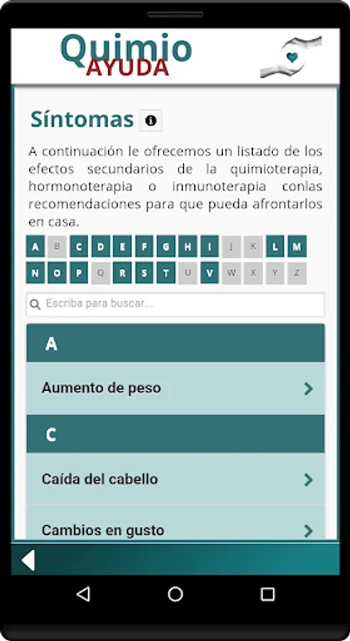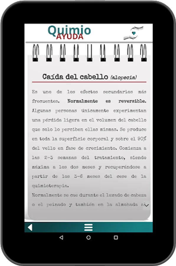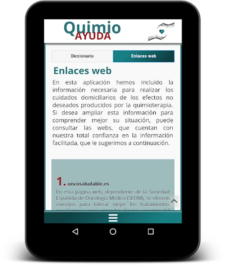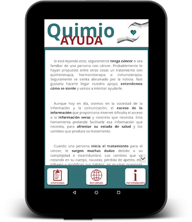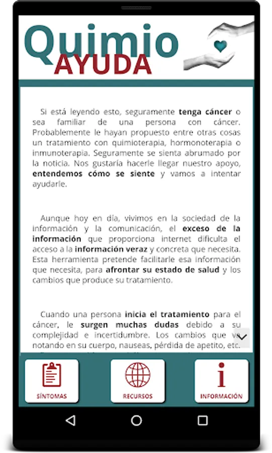 The aim of QuimioAyuda is to feel calmer and help them improve their quality of life during chemotherapy, controlling its side effects in their social and family environment.
