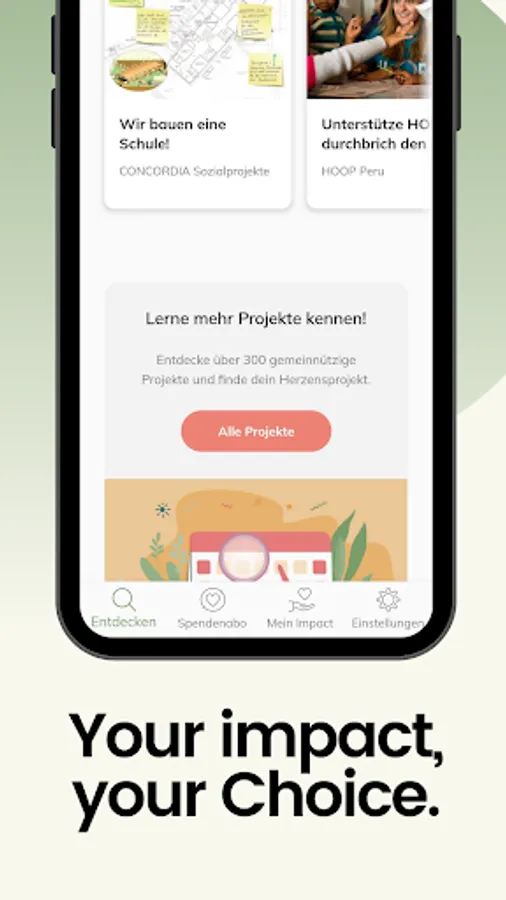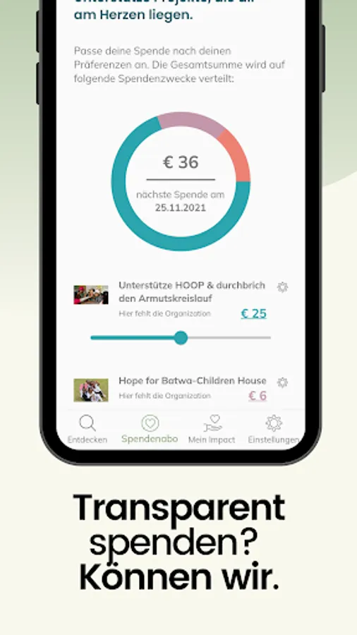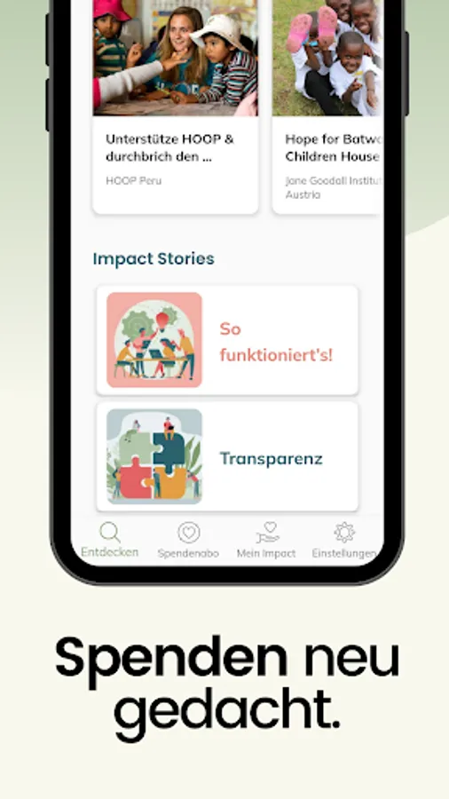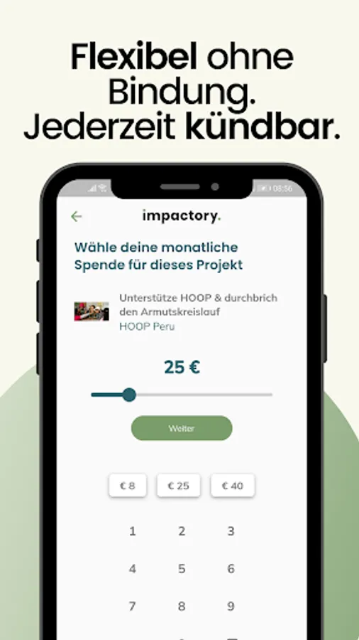 The impactory app makes it possible to do good quickly, easily and digitally. With just a few clicks, make a monthly contribution to make the world a little better. Customize your donation subscription to your preferences. This flexibility remains with you the whole time - you can change your donation amount or pause monthly. Or you can split your donation over several projects - that is also possible. True to the motto: Your Impact - Your Choice! Because we believe that it is our responsibility to approach our fellow human beings with kindness and compassion and thus to work together for a better future for everyone.