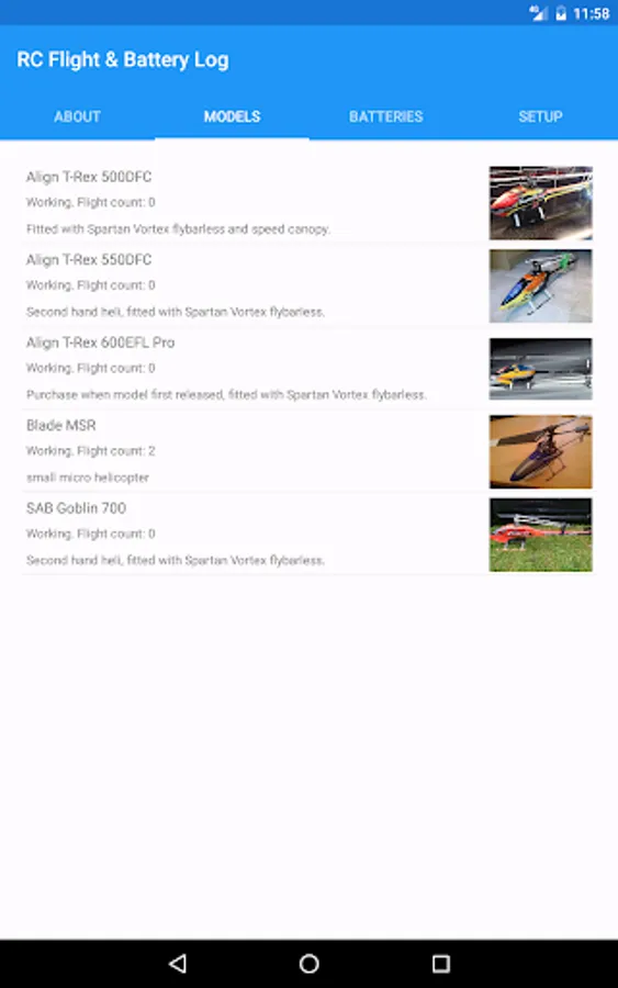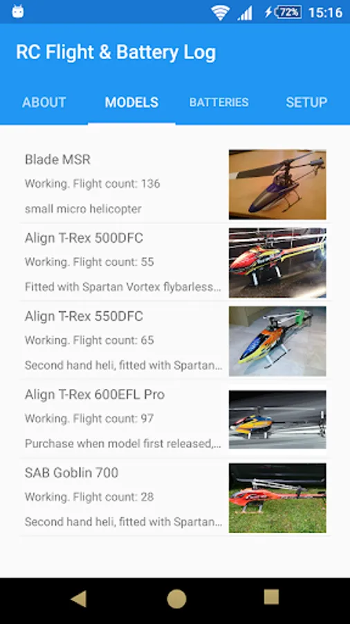 - tracks fuel usage for each model (nitro, gas and kerosene) in metric (ml) and gallons (US and UK)