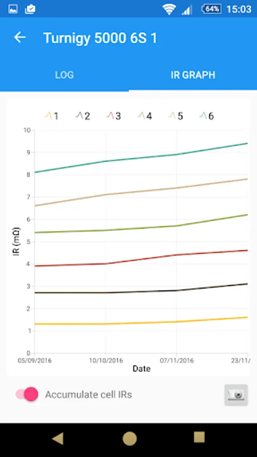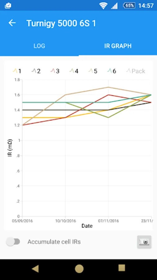 Log battery charge state, cycle count, IR (pack and individual cells).