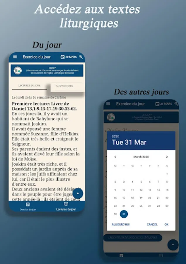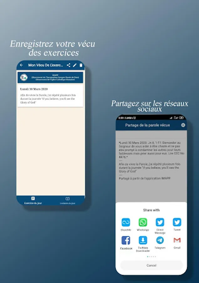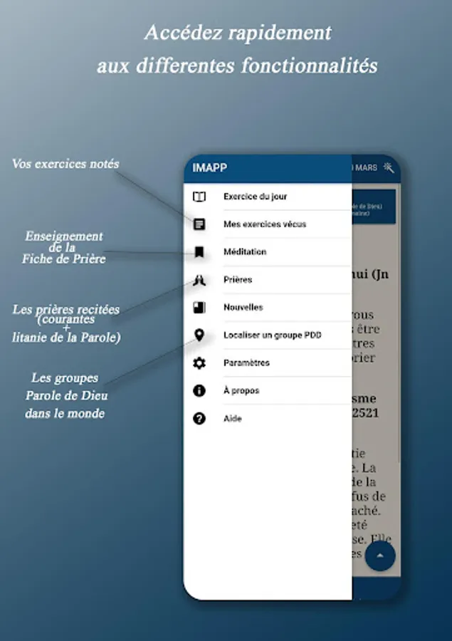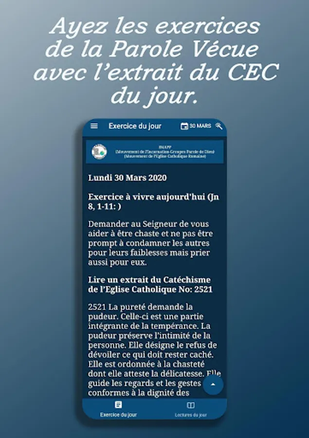 Allows the display of daily exercises, the gospel, as well as the teachings of the prayer sheet of the Movement of the Incarnation produced by Dr Bayemi Henri, Founder and General Manager of the Movement of the Incarnation