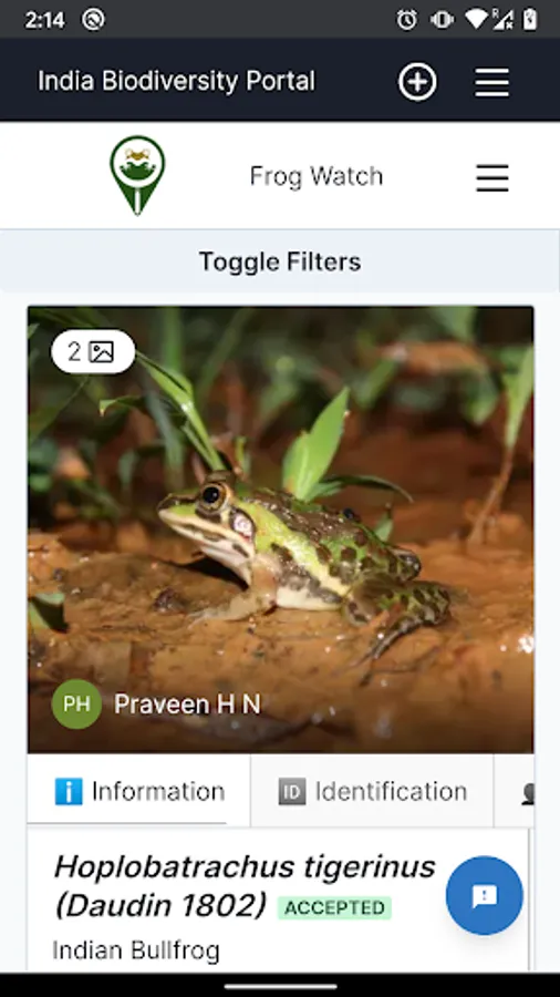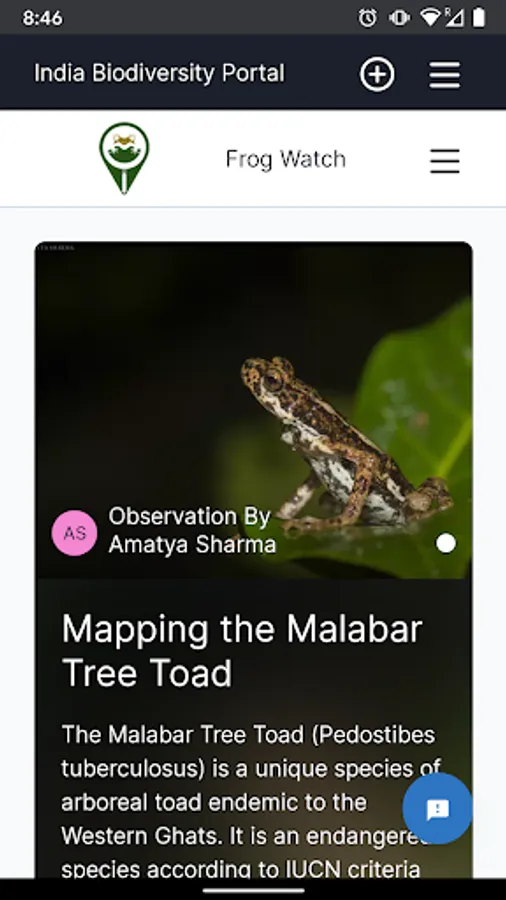 Frog Watch aims at mapping amphibians (frogs and toads, caecilians and salamanders) based on data that include observations, photographs, call records, identifications, locations, behaviours and so on collected by citizens and citizen science programmes in India.