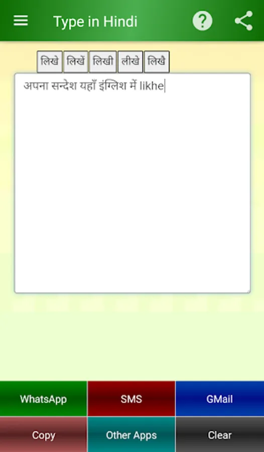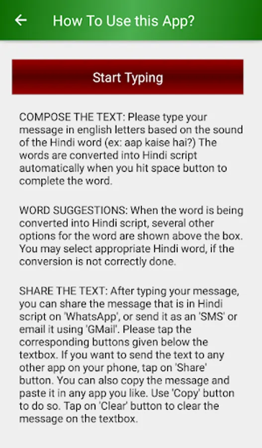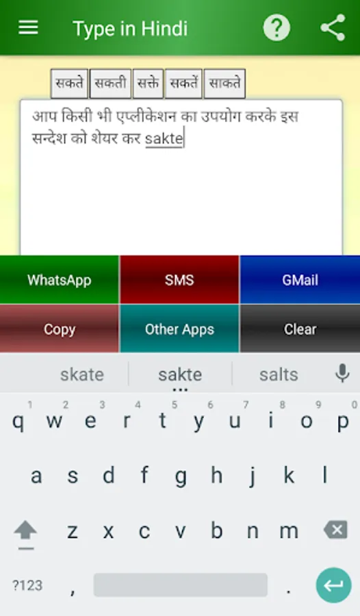 'Type in Hindi' app allows you to share and store the converted message using any app on your phone such as WhatsApp, SMS Messages, GMail, Saving as Documents etc. You can copy the converted text using 'Copy' option and paste it on any app such as Facebook, SMS, GMail, Twitter, Instagram or any app that you like.