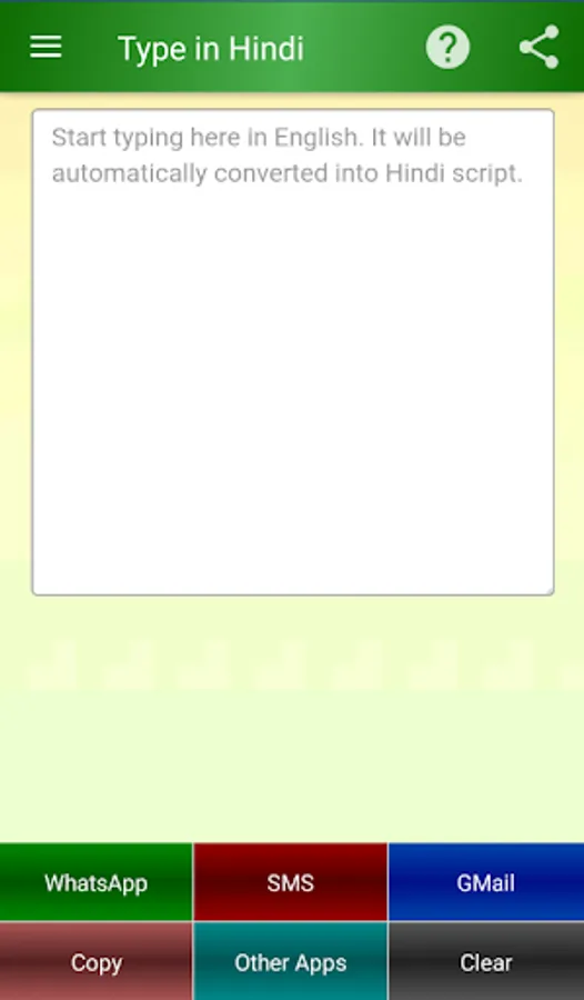'Type in Hindi' app allows you to share and store the converted Hindi script using any app on your phone such as WhatsApp, SMS Messages, GMail Messages, Saving as Documents etc