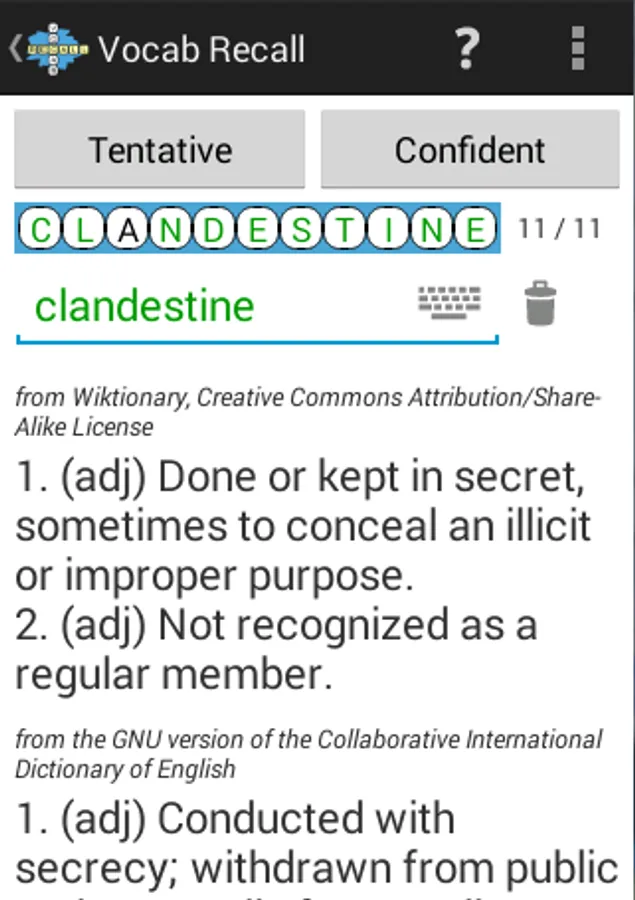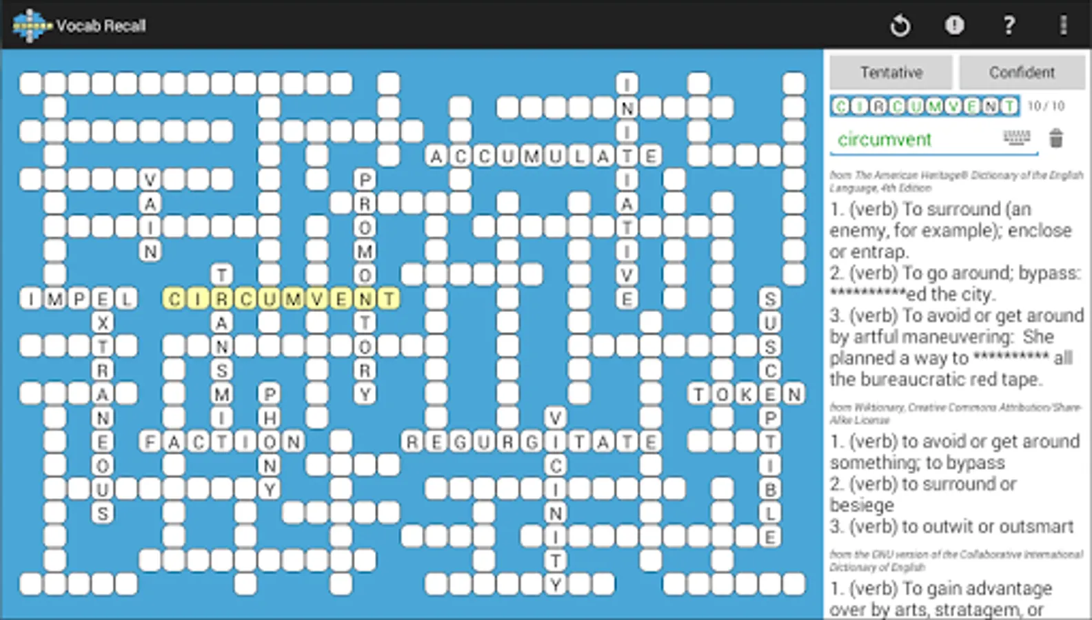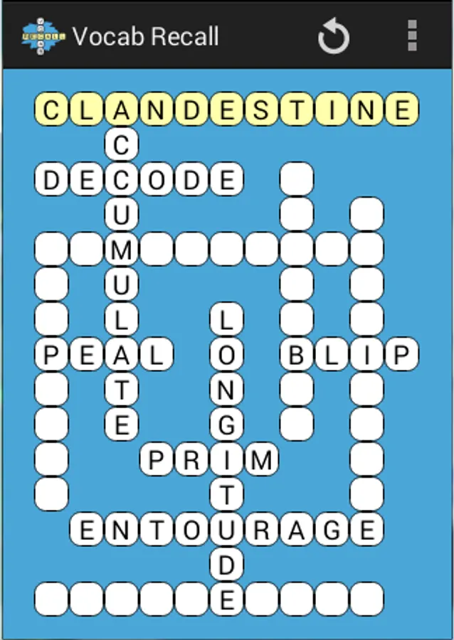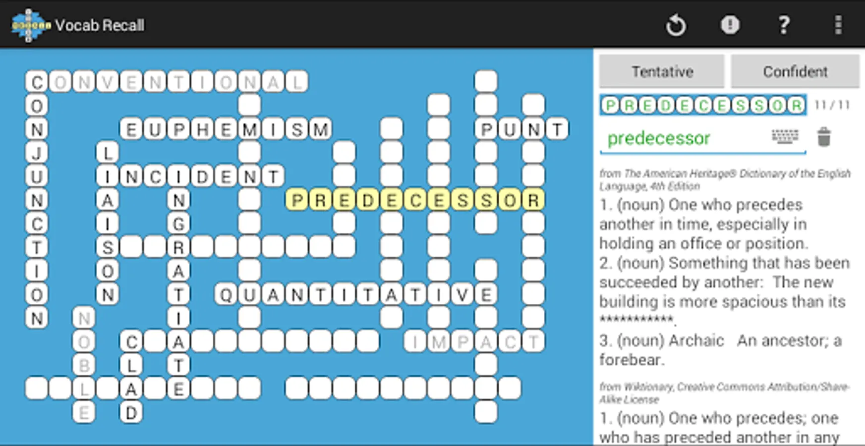 This game takes the form of a crossword puzzle, with dictionary entries as clues. The emphasis is not on trying to stump the player, but on providing practice recalling words so it will become easier during natural conversation. A limited number of extra hints are available per game for those last few words that are difficult to get.