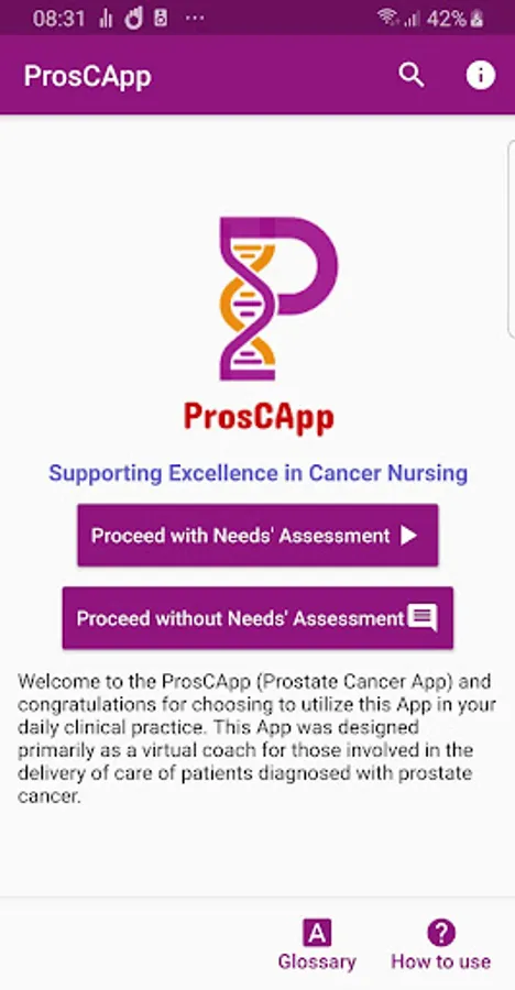Welcome to the ProsCApp (Prostate Cancer App) and congratulations for choosing to utilize this App in your daily clinical practice. This App was designed primarily as a virtual coach for those involved in the delivery of care of patients diagnosed with prostate cancer.