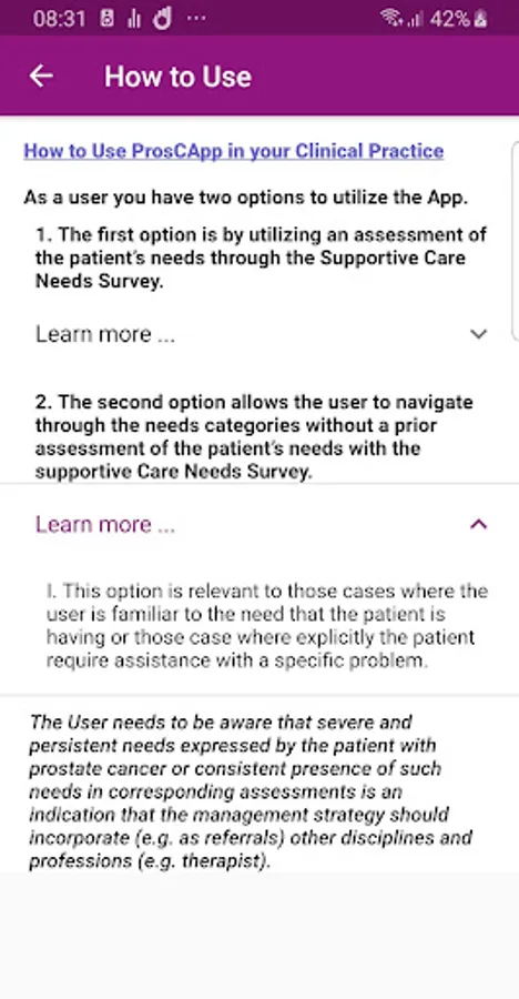 The ProsCApp provides only a virtual coach approach to identifying and addressing needs in this patient group and it is not meant to replace expert clinical critical thinking.