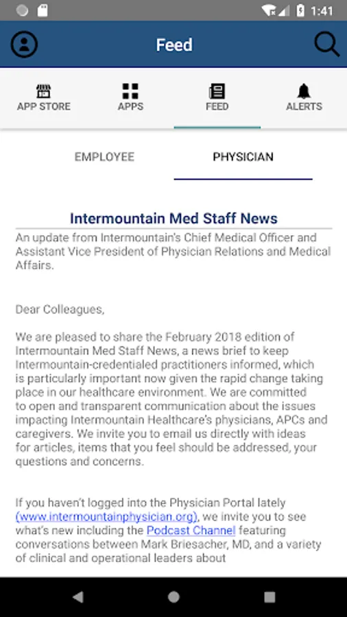 Some of the key features include the ability to easily view, install, and access any Intermountain Mobile App, access newsfeed, check alerts, and much more.
