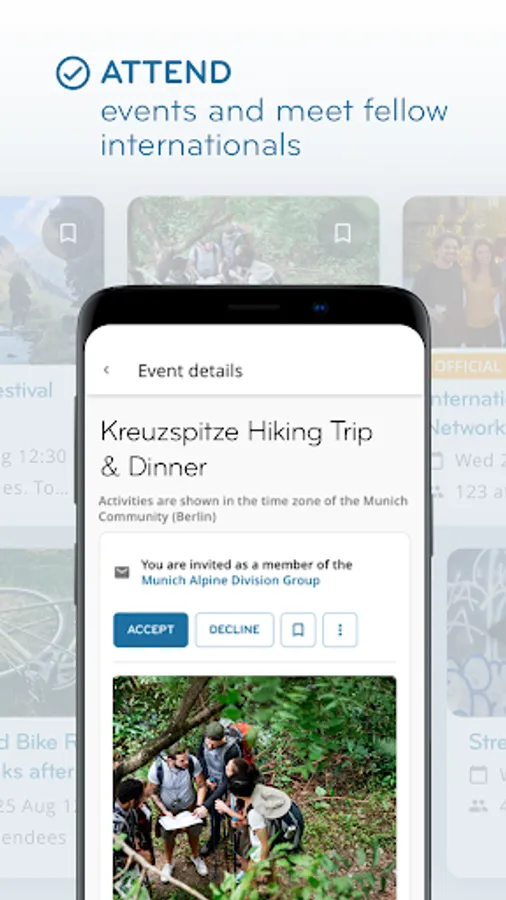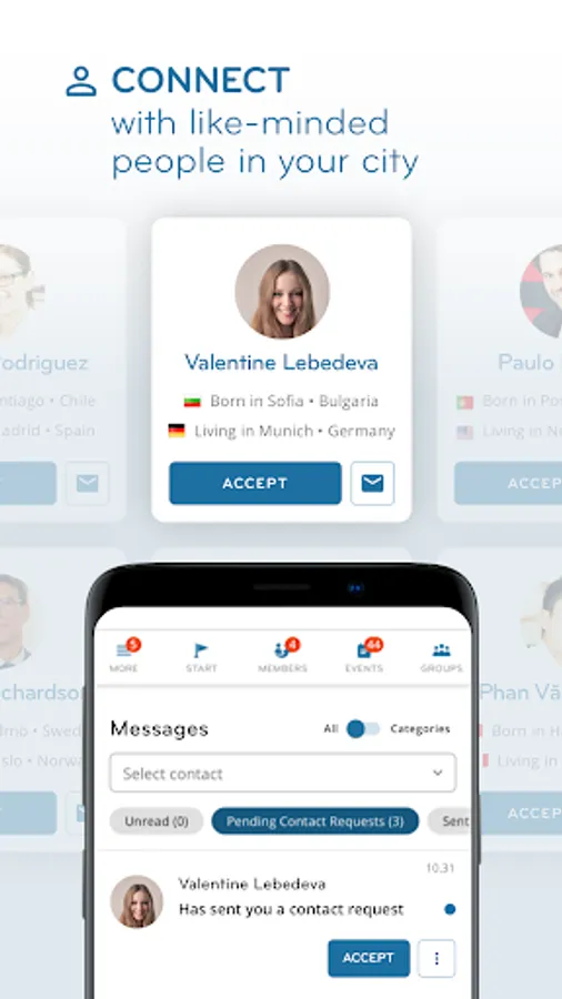 InterNations is the world's largest network for people living and working abroad. As a member of our global community, you can network, socialize, and find expat-relevant information — both online and face-to-face. InterNations has communities in 420 cities around the world, making it easy for you to meet expats and global minds in your city. Our app will help you to find new friends, grow your network, and discover a wide range of events where you can share your experiences with like-minded people.