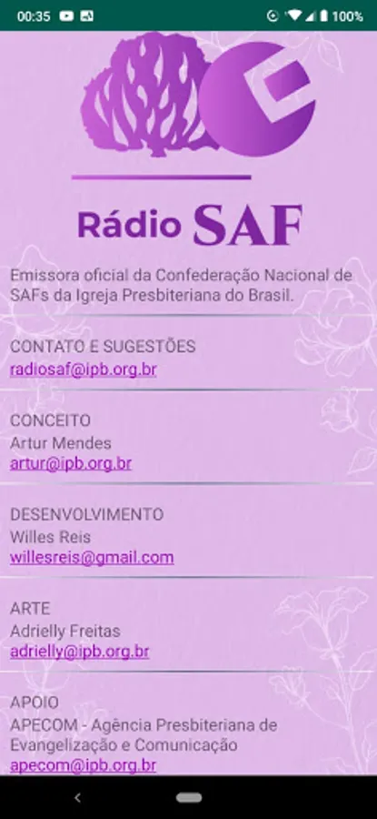 Official broadcaster of the National Confederation of SAFs (Female Helping Societies) of the Presbyterian Church of Brazil.