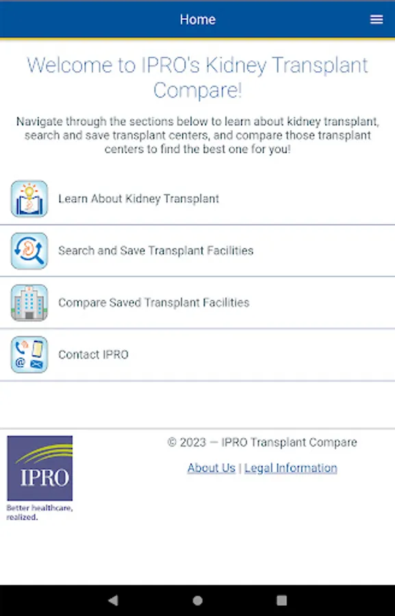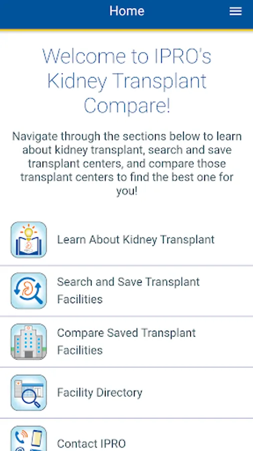 IPRO’s Kidney Transplant Compare provides education to adults living with Kidney Disease on kidney transplantation as the preferred treatment option and to support informed-decision making to select a transplant center that is best for them. The use of the Kidney Transplant Compare starts with education on what a kidney transplant is, how to determine if it is the right choice for the person with kidney disease and what their options are regarding a type of transplant. It then leads to the compare portion of the application that allows patients and their families to filter and compare transplant centers in their areas to understand the patient selection criteria, support services offered, and transplant outcome data provided by the Scientific Registry of Transplant Recipients (SRTR). The compare data is described in common terms and provides information that patients have voiced is important them and their family in choosing a transplant center like; the average wait time for a transplant at that center, how many transplants the center does, if they will accept patients with a higher body weight, or if patients can do their work up in 1-2 days.