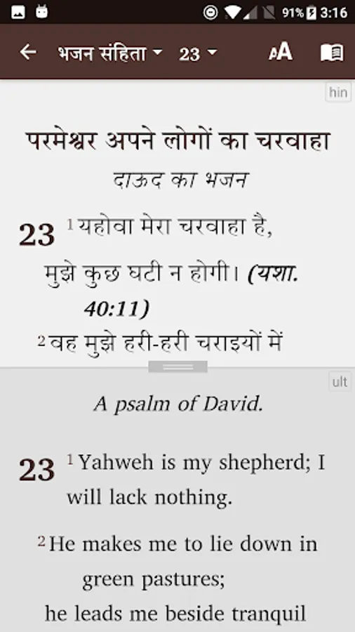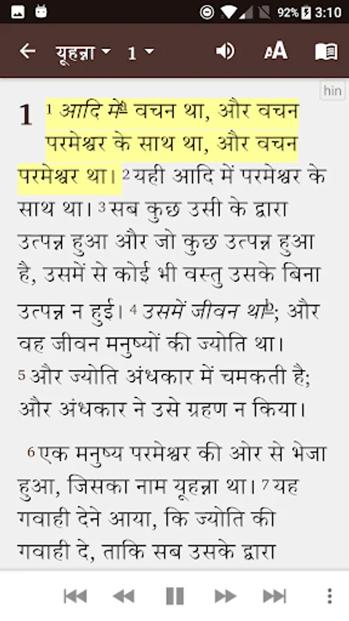 Read, listen and meditate on the WORD of GOD in Hindi using the Hindi Bible app. Hindi Bible app supports almost all Android devices. We have made this app available absolutely free for you to download and use. Hindi Audio Bible has been integrated into our app. So, whenever you need to listen to the audio, just press the "Speaker" icon from the app's menu bar. The audio in the Hindi Bible app has been synchronized with the text. It will automatically highlight the verse for you when you play the Audio Bible. The Parallel English Bible is another outstanding feature in the Hindi Bible app. English and Hindi Bible verses can be displayed in two-pane or verse-by-verse layout.