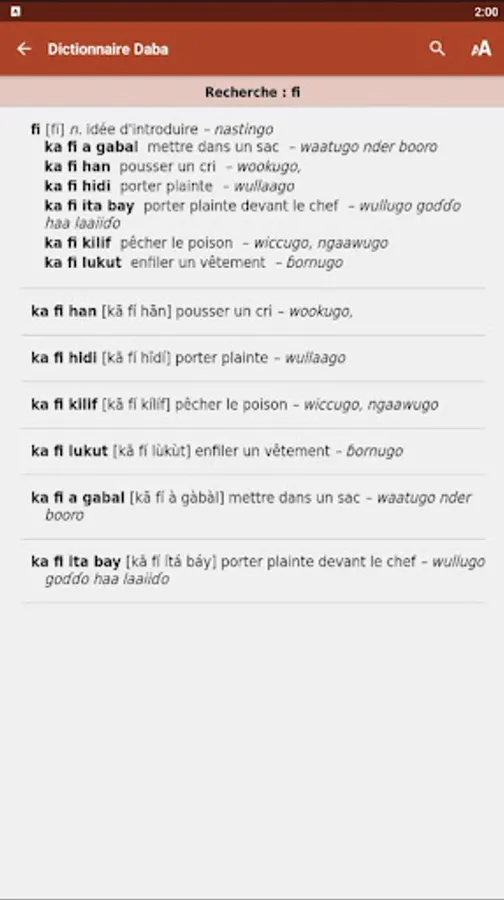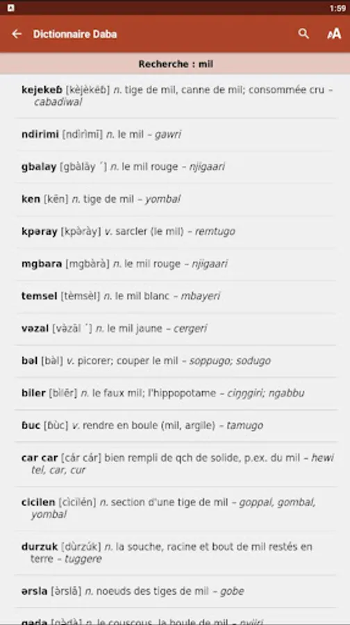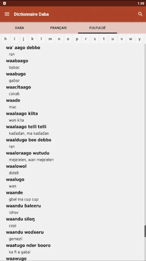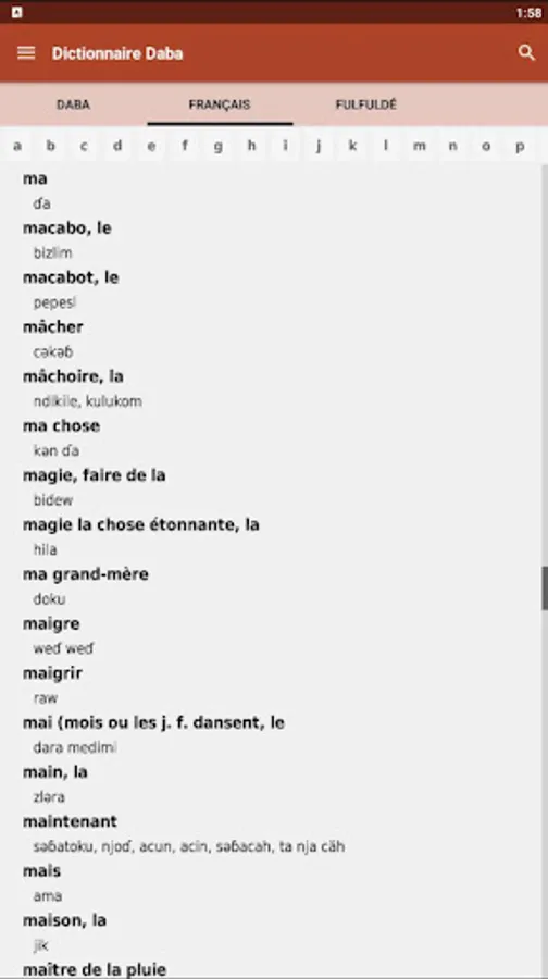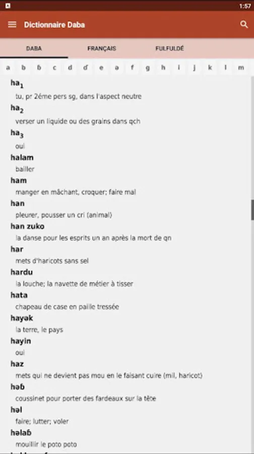 The Daba Dictionary app is intended for those who would like to look up Daba words to find the French or Fulfulde equivalent, or to find the Lagwan word via a French or Fulfulde gloss.