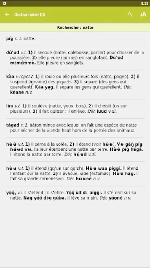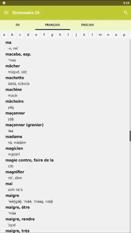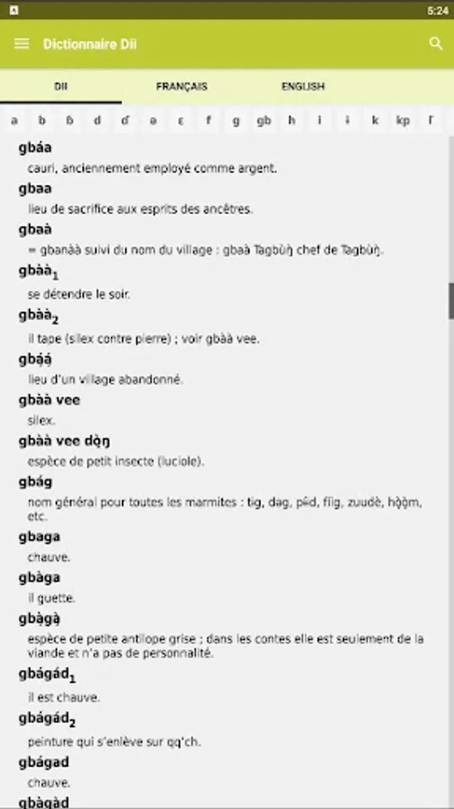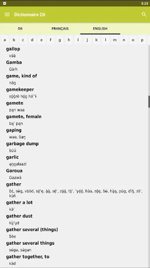 This dictionary app is intended for anybody who wants to study or learn the Dii language or simply for looking up Dii, French or English words to find the equivalent word or expression in the other languages.