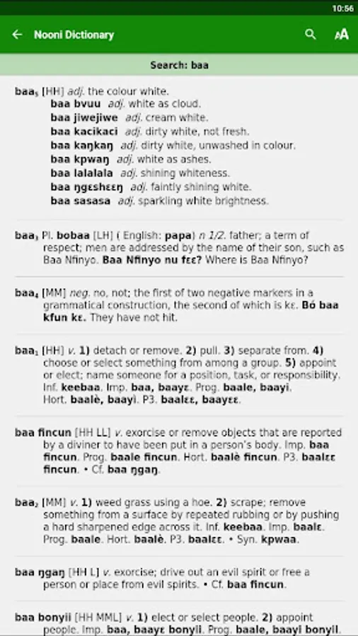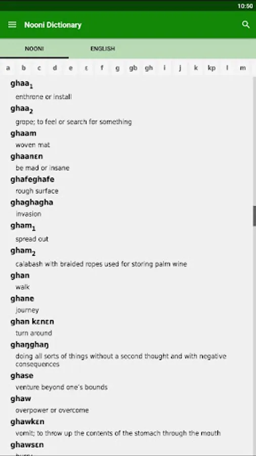 This dictionary app is intended for anybody who wants to study or learn the Nooni language or simply for looking up Nooni or English words in order to find the equivalent word or expression in the other language.