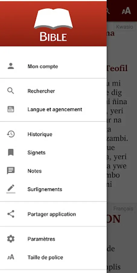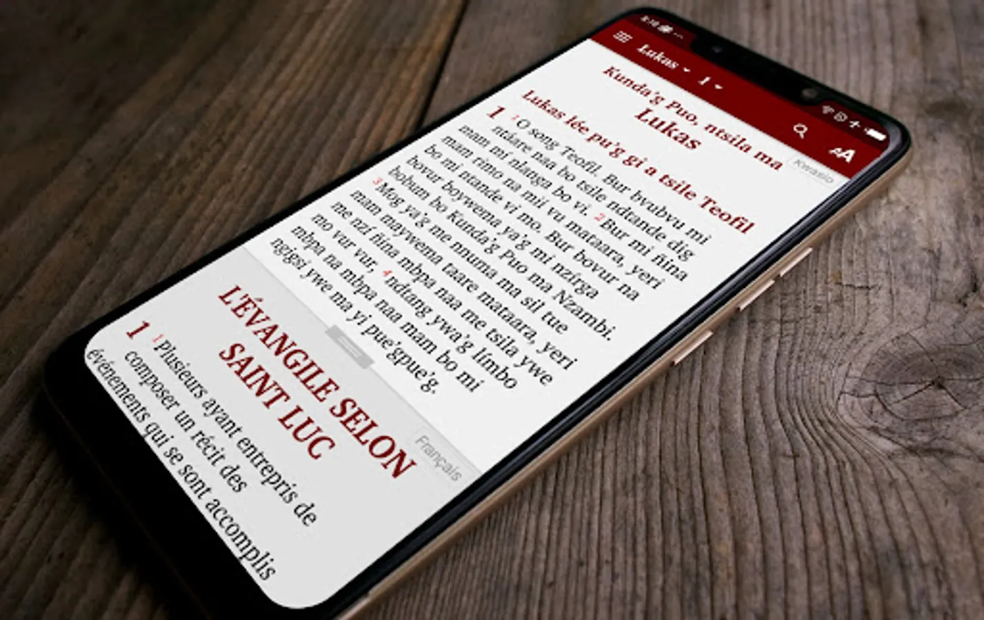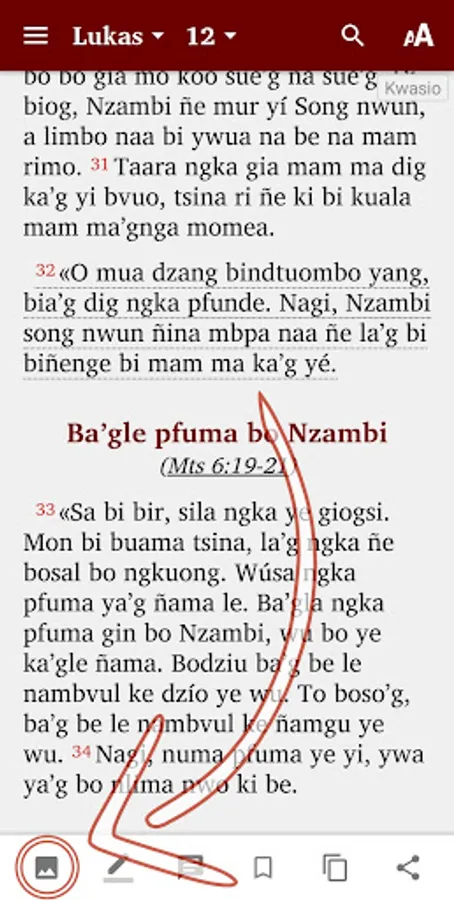 "kwasio Bible" is an app for reading and studying the Bible in the Kwasio language * (spoken in the southern region of Cameroon). The French Bible Louis Segond 1910 is also included in the application.