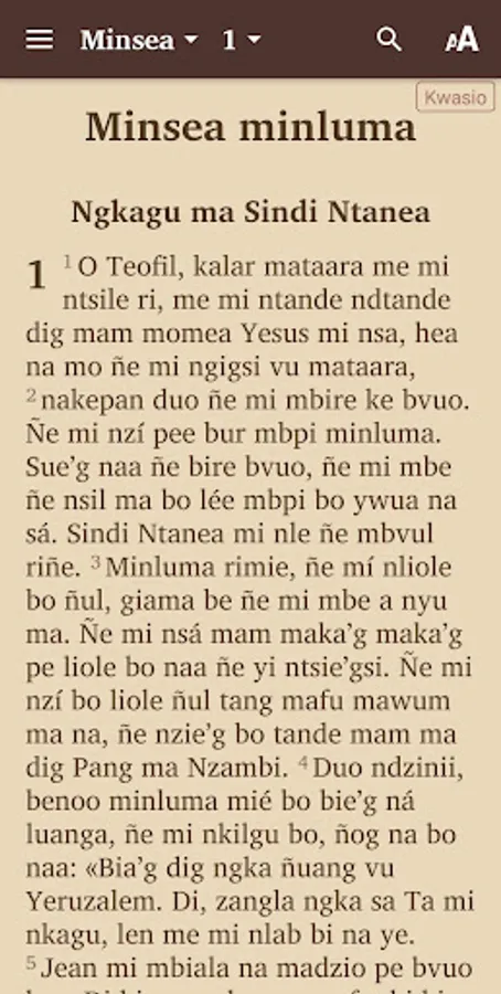 Currently available Kwasio Bible books are included in this app. As more books are translated and approved, they will be added.