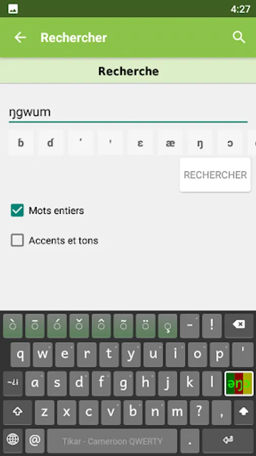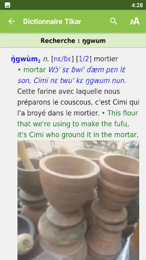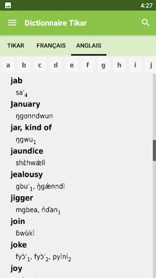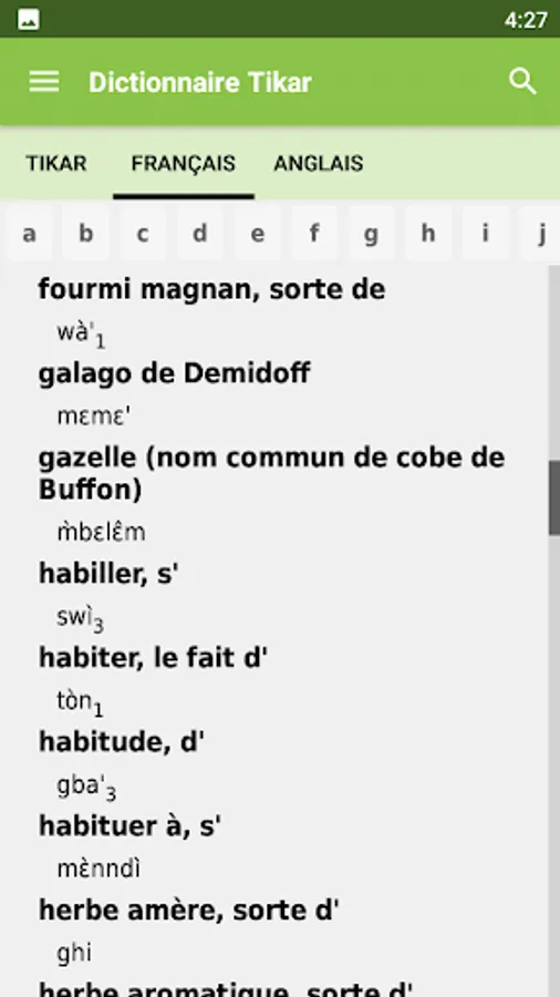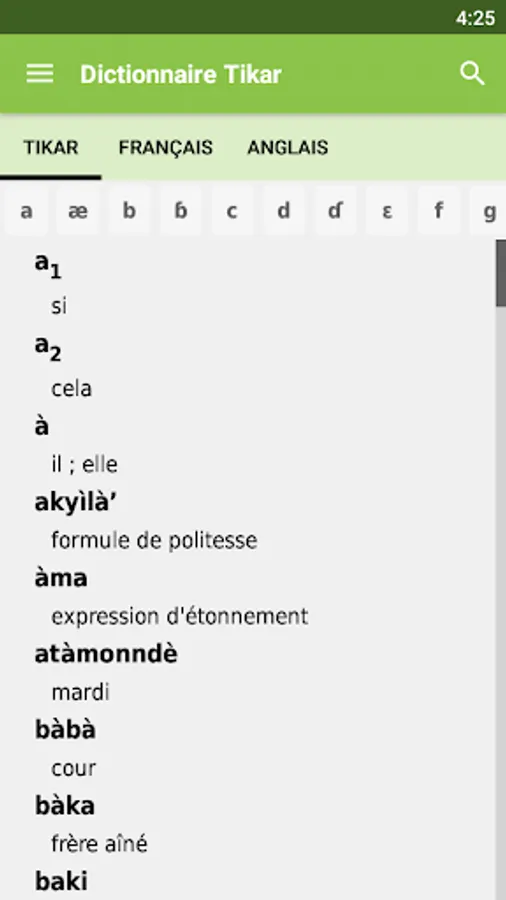 The Tikar Dictionary app is intended for those who would like to look up Tikar words to find the French equivalent, or to find the Tikar word via a French or English gloss.