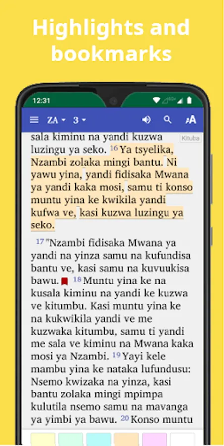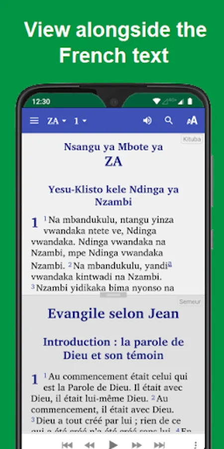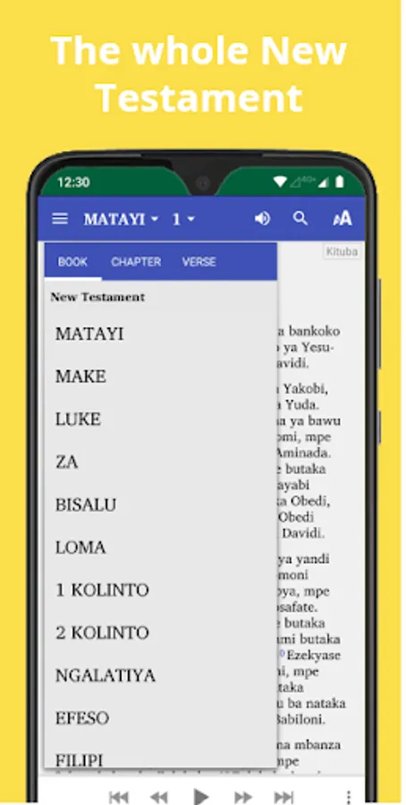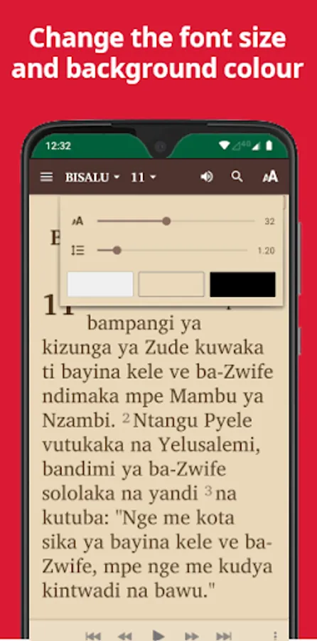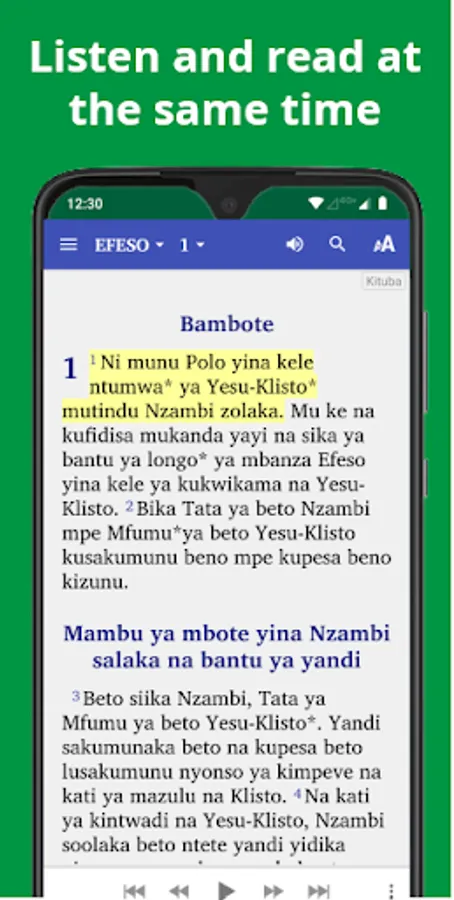 • Read text and listen to audio. Each sentence is highlighted while audio is playing (New Testament)