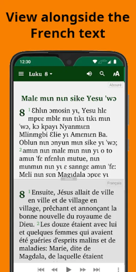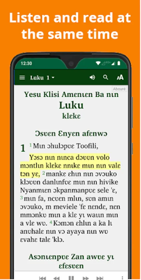 • Read the text and listen to the audio of the book of Luke. Each phrase is highlighted as the audio is played.