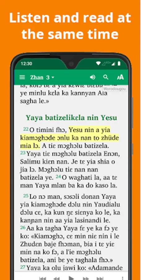 • Read the text and listen to the audio of the book of John. Each phrase is highlighted as the audio is played.