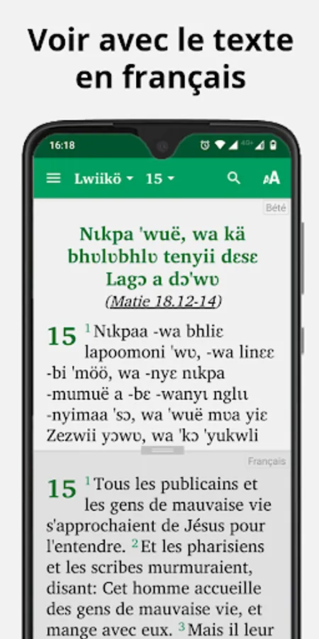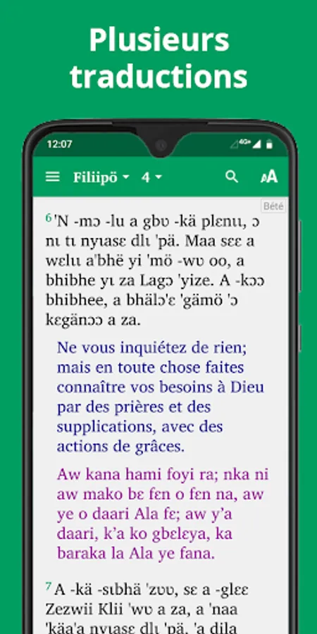 • View text alongside the Jula, Bété, English NIV, French Semeur or French Louis Segond translations
