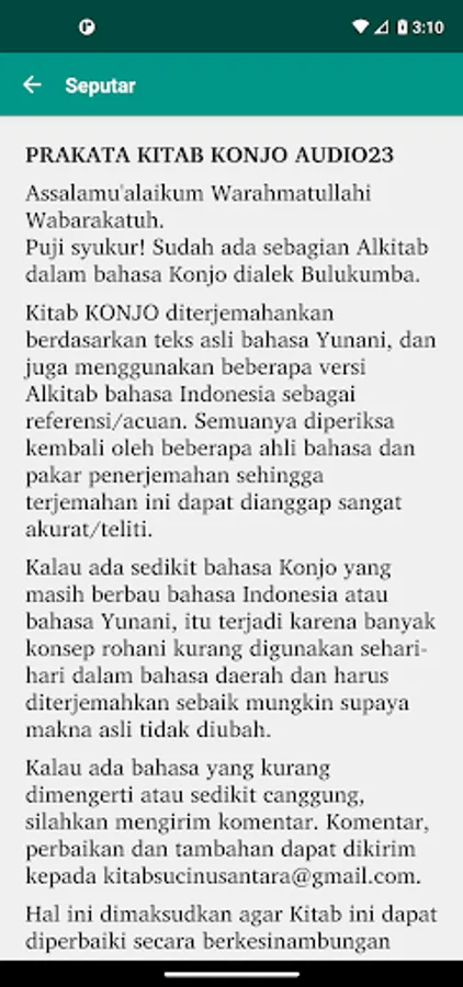 - If anything is found that is hard to understand or awkward/stiff. please send comments, suggestions for improving or additions. These can be sent to kitabsucinusantara@gmail.com.