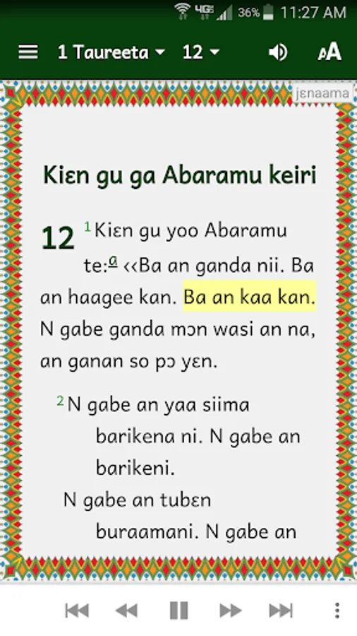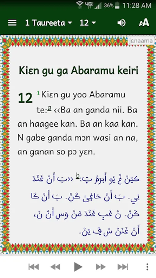 The Jenaama text of Genesis and the Gospel of Luke, the book of the prophet Yuunus and other books, is accompanied by a reading (1-5MB each).