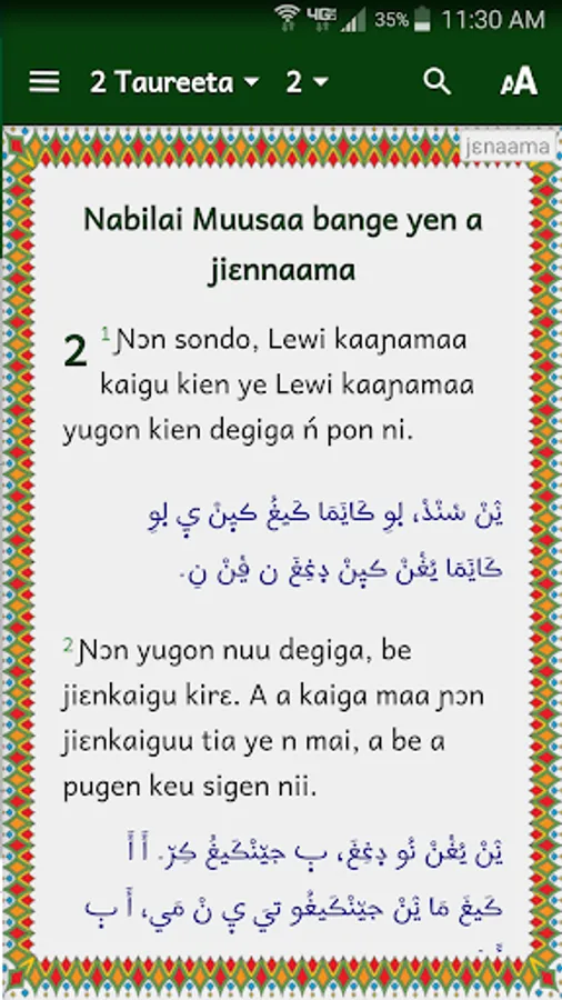 Ala Jiɛmu presents two translations of parts of the Holy Bible in Bozo Tyéyaxo (Tigemaxoo) and Jenaama.