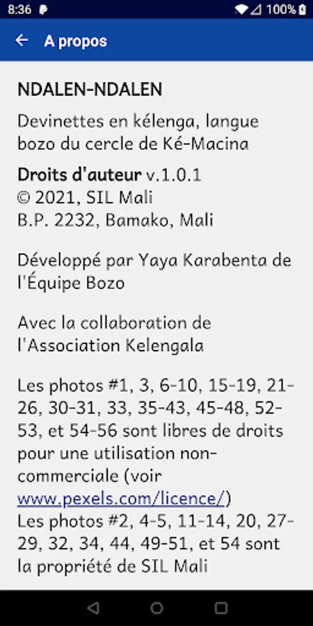 The Ndalen-ndalen app contains a collection of riddles in the Kelenga language, the Bozo language of the Ké-Macina circle (Mali). After listening to a riddle, try to guess the answer! You decide if you want to take your time to think it over or listen to the answer right away. A word of advice: it's even more fun with friends! :)