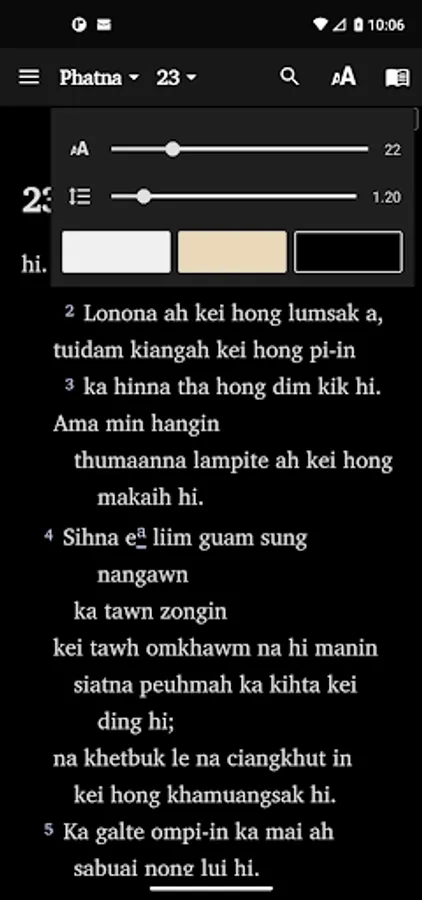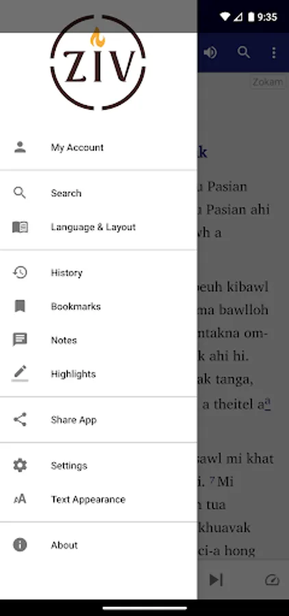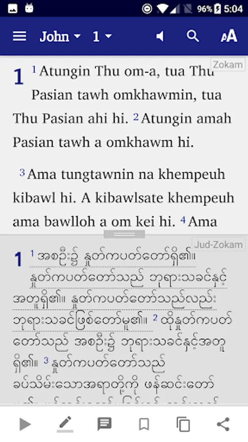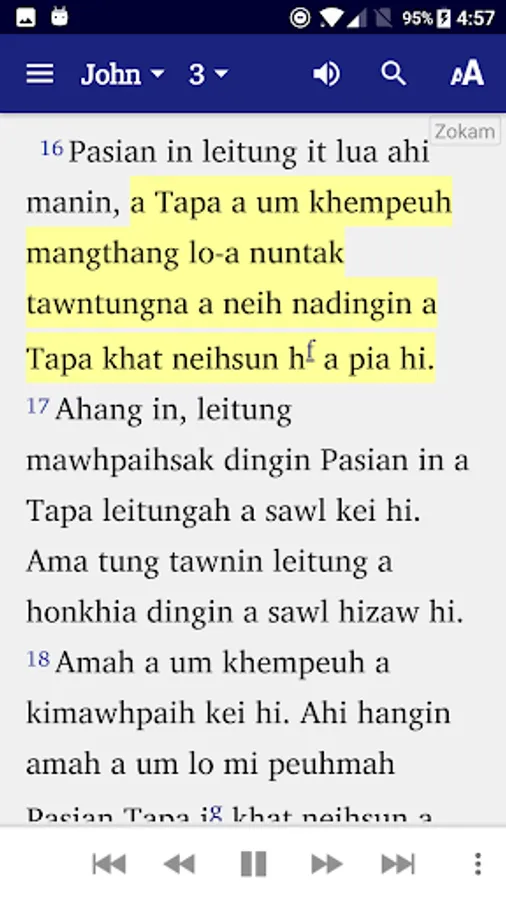 - The Zokam New Testament audio is synced to the text, highlighting it phrase by phrase as the audio plays, allowing the user to read and listen to the Bible at the same time
