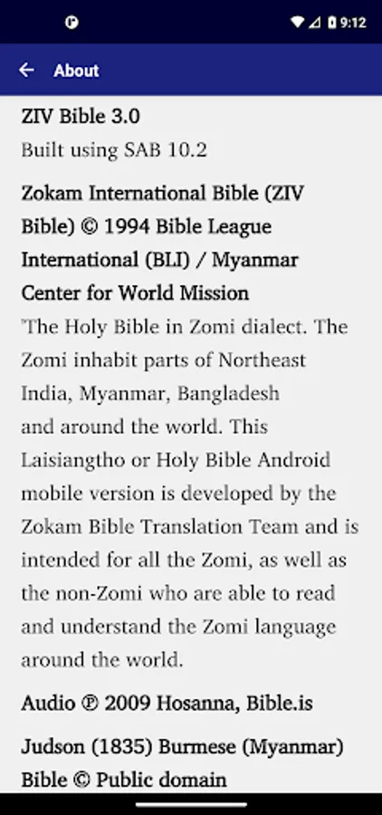 This is the Zokam (Zomi) language Bible app for Android. This version contains both the Old and New Testaments, as well as downloadable audio recordings that can be listened to while reading the New Testament. Also included in this app is the Judson Burmese (Myanmar) Bible. The ZIV and Myanmar Bible verses can be displayed in parallel two-pane layout, or verse-by-verse layout. Free download with no ads.