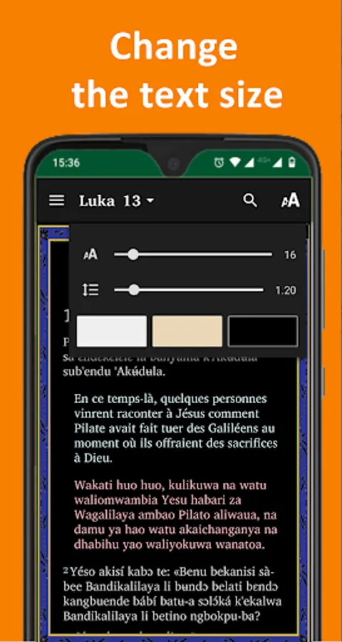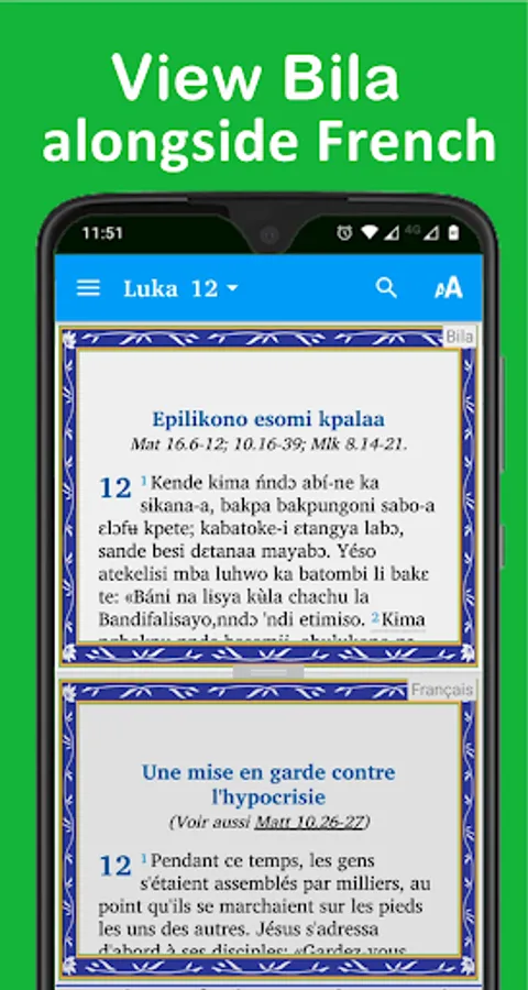 • View Bible text in Bila alongside French and/or Kiswahili translation.