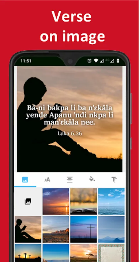 • Use the "Verse on Image Editor" to create beautiful images to share with your family and friends via email, Facebook, WhatsApp or other social media.