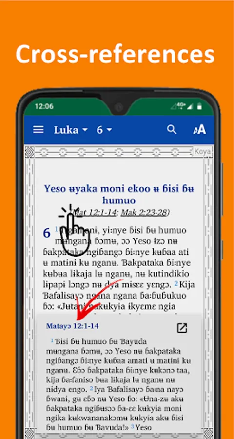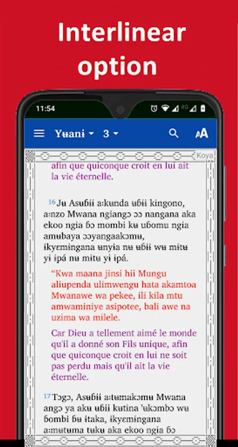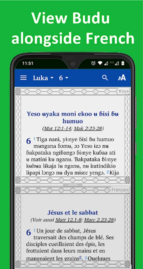 "Budu Koya Bible" is an app for reading and studying the Bible in the Budu Koya language ( also known as Bodo, Ebudu, or Kibudu) spoken in the Democratic Republic of Congo. The French Bible "Français courant 97' and Swahili Bible "Toleo Wazi Neno" are also included in the application.