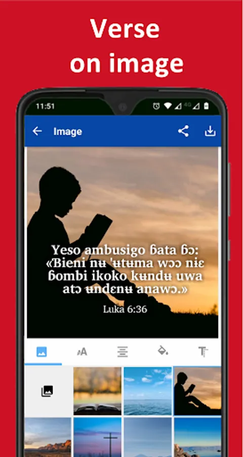 • Use the "Verse on Image Editor" to create beautiful images to share with your family and friends via email, Facebook, WhatsApp or other social media.