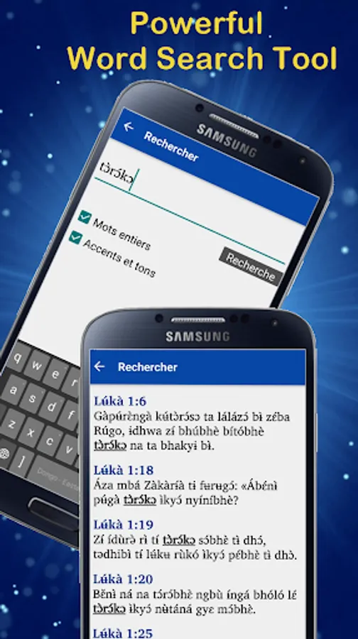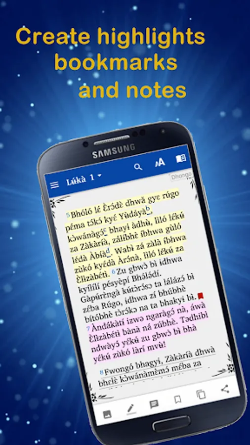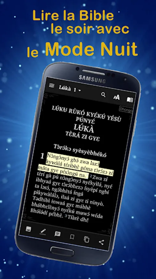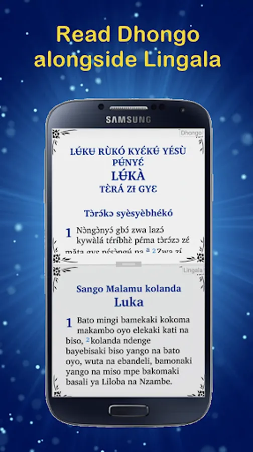 "Dhongo Bible" is an app for reading and studying the Bible in the Dhongo language ( also Dhɔ̀ngɔ̀kɔ) spoken in the Democratic Republic of Congo. The Lingala Bible version " Salela na bonsomi Mokanda na Bomo" are also included in the application.