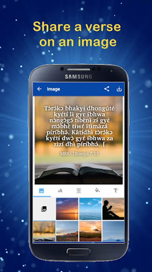 • Use the "Verse on Image Editor" to create beautiful images to share with your family and friends via email, Facebook, WhatsApp or other social media.