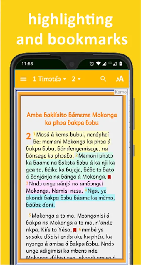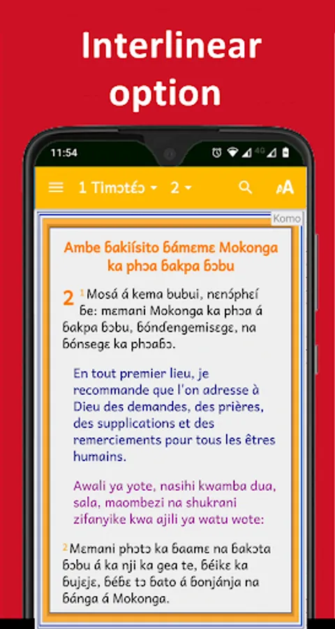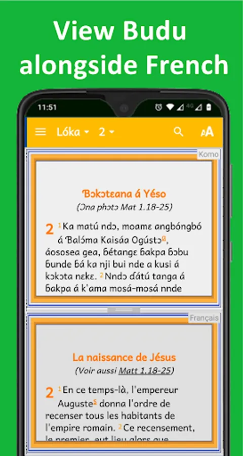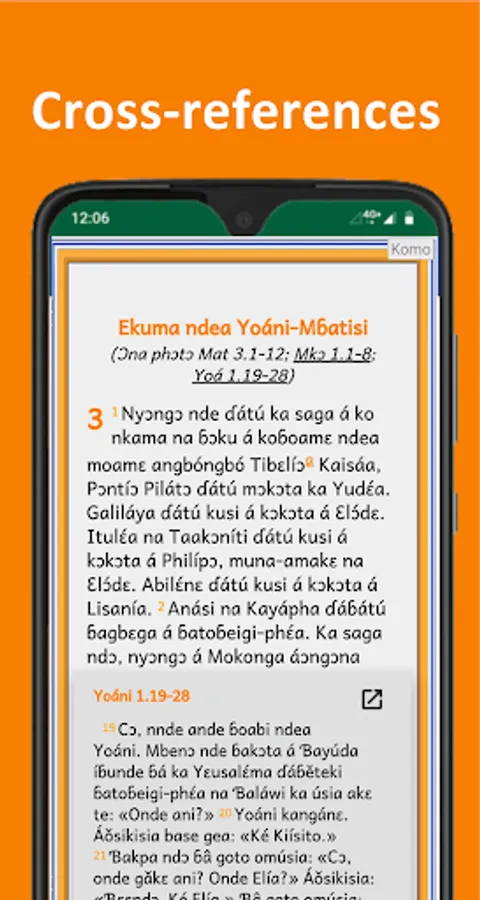 "Komo Bible" is an app for reading and studying the Bible in the Komo language (also known as Kikomo, Kikumo, Kikumu, Kikuumu, Kumo, Kumu, Kuumu) spoken in the Democratic Republic of Congo. The French Bible "Français courant 97' and Swahili Bible "Toleo Wazi Neno" are also included in the application.