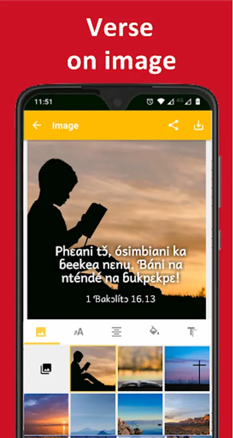• Use the "Verse on Image Editor" to create beautiful images to share with your family and friends via email, Facebook, WhatsApp or other social media.